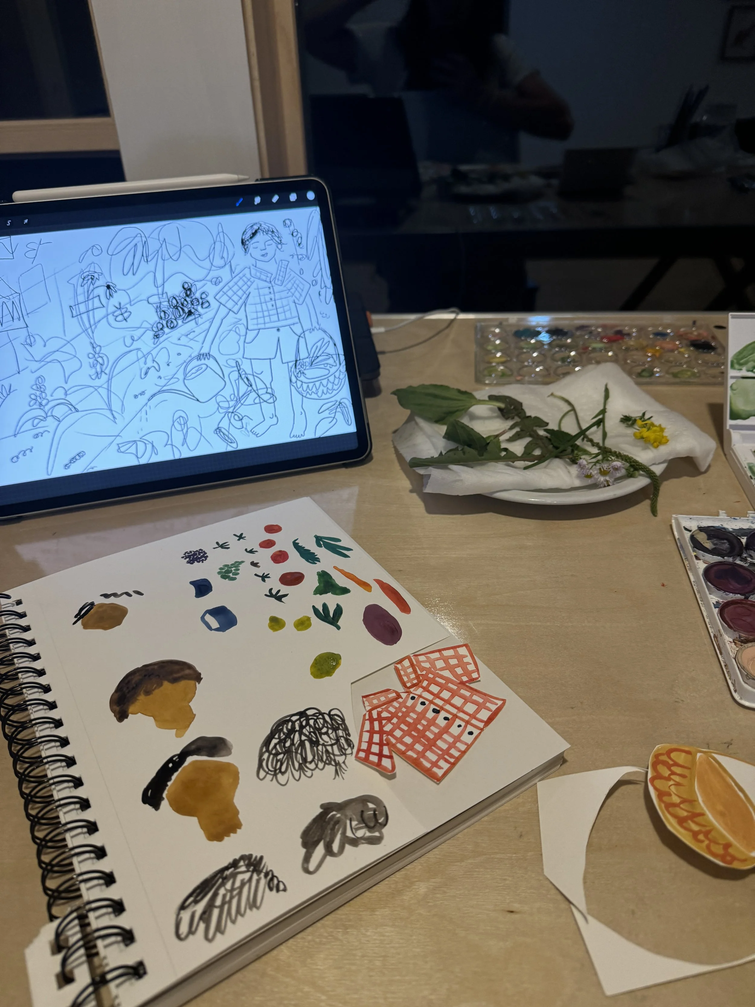 I painted what I had brought in. Then I cut it all up. This went on and then I went into town to get groceries with some friends, cooked dinner for our group, ate, hung out, then found myself walking back in the dark to the studio for the evening. I opened my iPad to a story I’d written and notionally illustrated called One Big Yard. I didn’t think, I just kept playing.