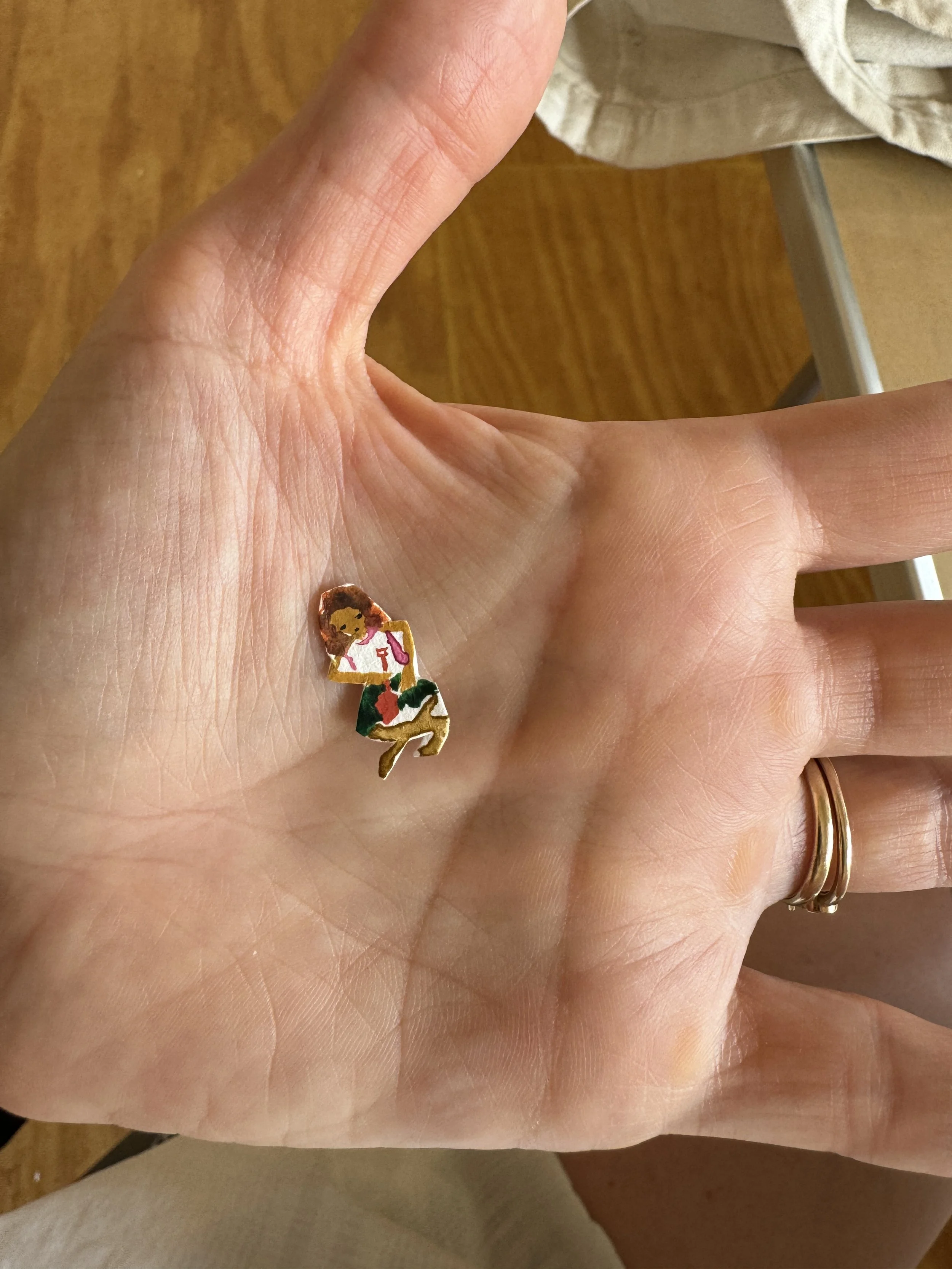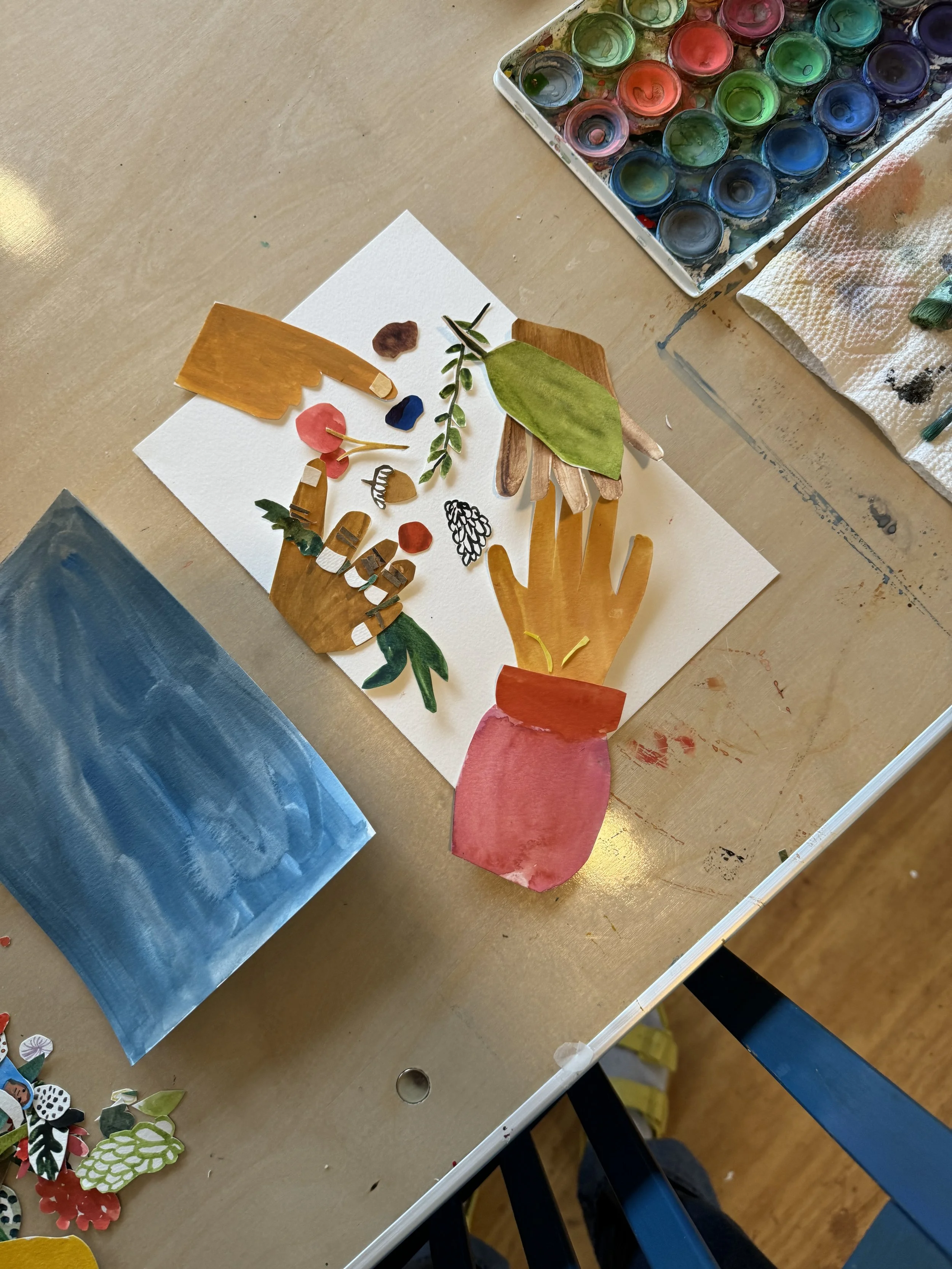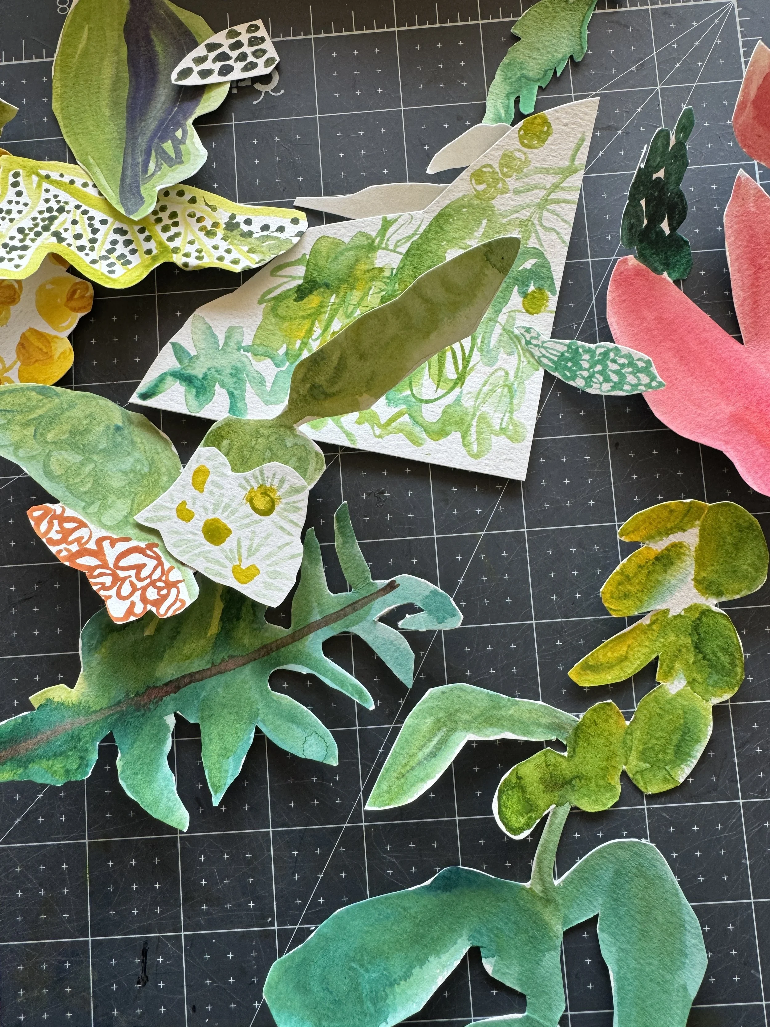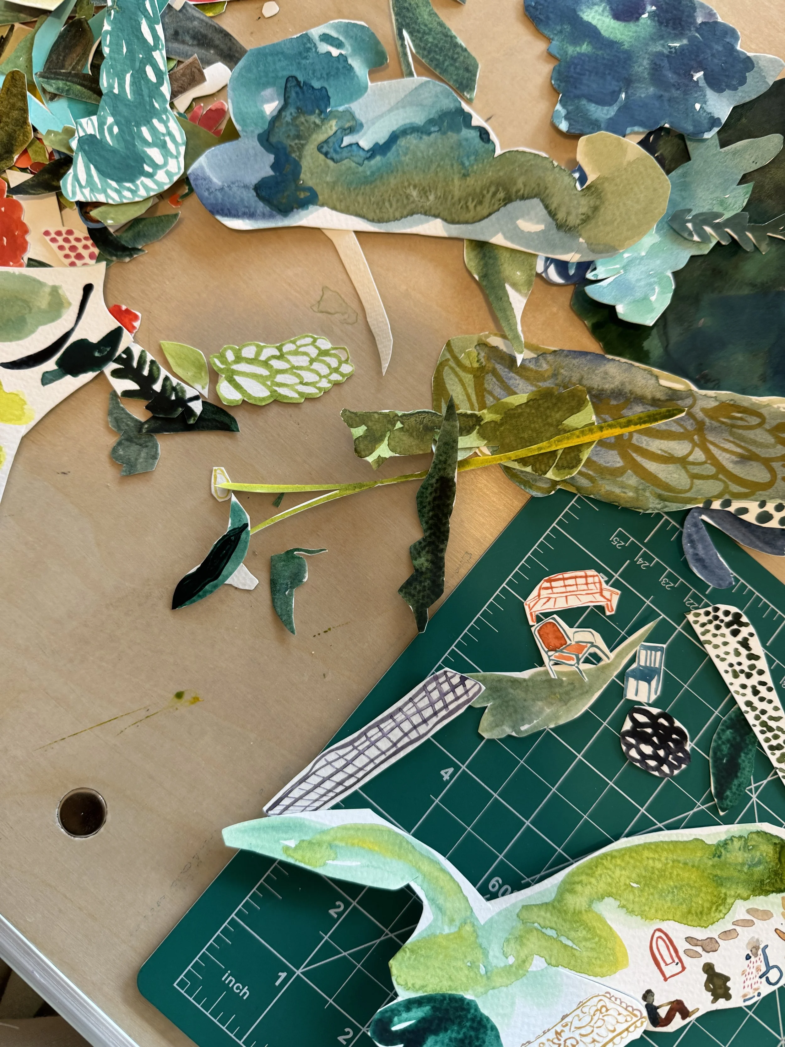 I kept going. The next morning I flipped to the first spread in my book, and painted it. Cut pieces out. Arranged and arranged and arranged again. It was so freeing. I was painting at this tiny scale, slow, but fast because if it wasn’t working for me, I would just grab a new piece of paper and paint again and cut out a new shape. I am use to the challenge of painting on big walls and this was a scale change for sure. But the physicality of cutting each piece out by hand was welcomed. My hands were so tired at the end of the day. Tired, but ready for more. I went to bed so excited to wake up and make.