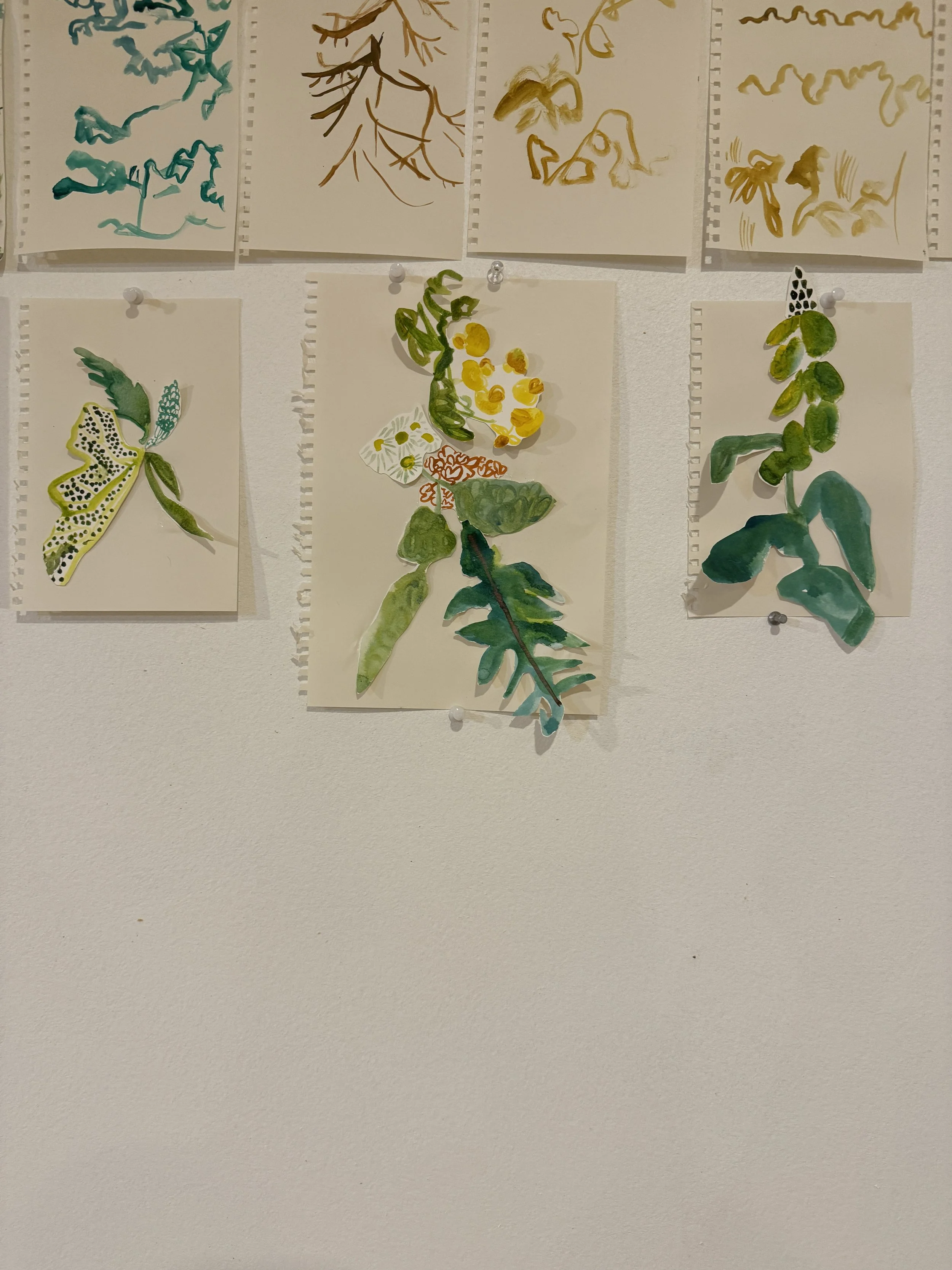 At my desk, I looked out my window and started to paint - some blind contours, some paintings of the greens I saw in the mountain trees, some sketches of weeds growing waist height. Then after a bit, I turned to the pieces of nature I had collected that morning.